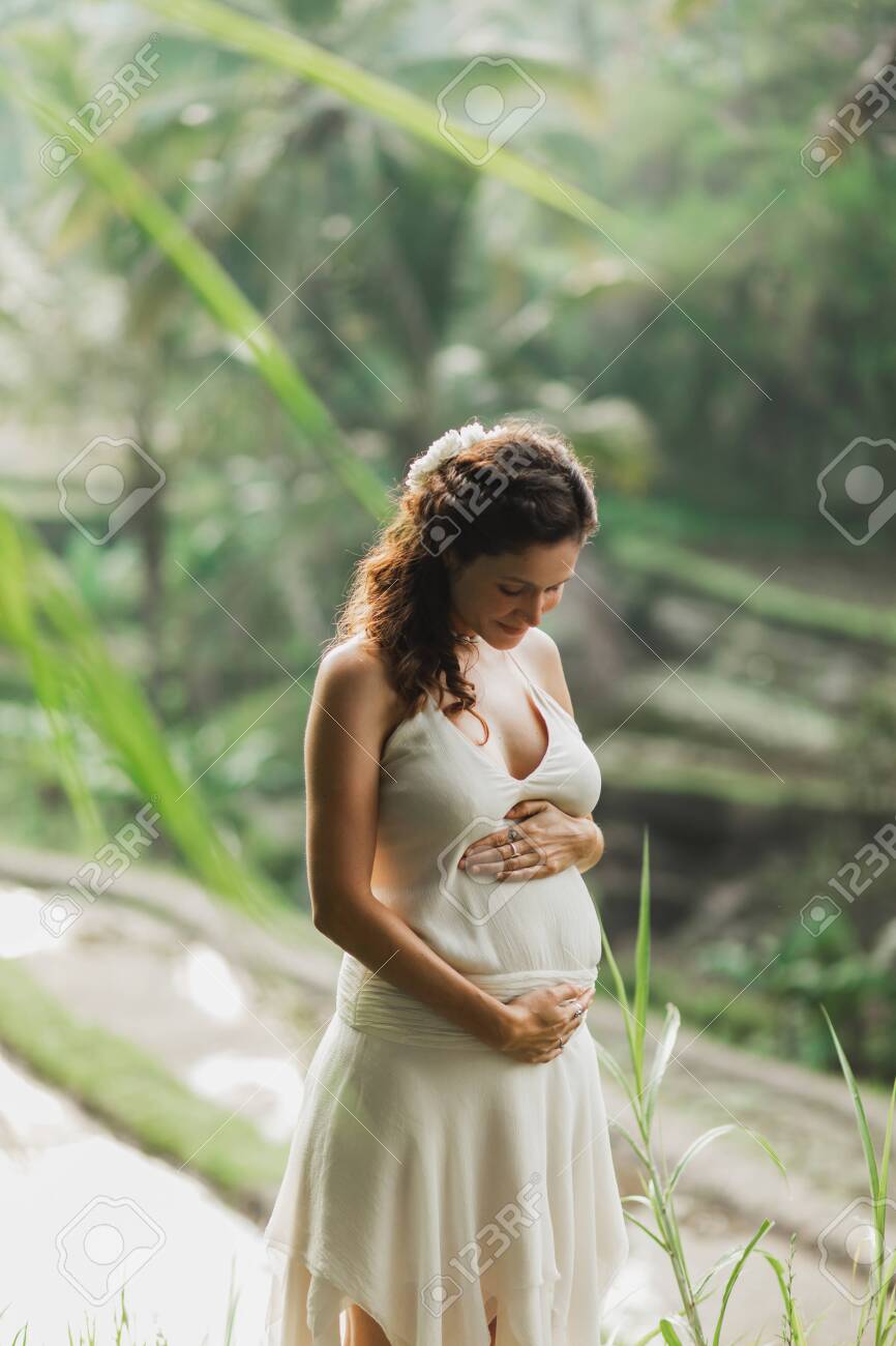 Young Pregnant Woman In White Dress With View Of Bali Rice